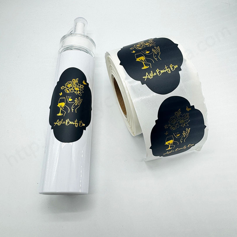 Etiquetas adhesivas de PVC a prueba de agua personalizadas, Impresión de logotipo de oro laminado, brillante para embalaje cosmético, etiqueta de lámina dorada