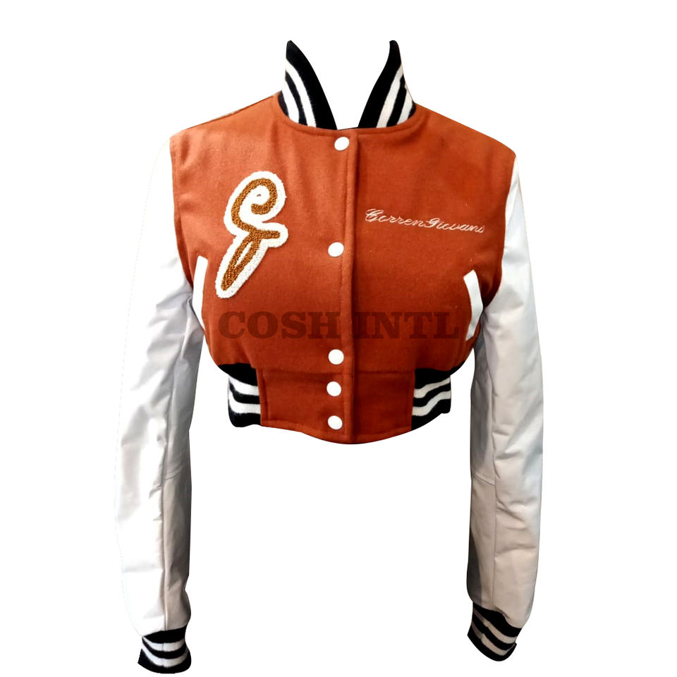 Chaqueta de béisbol corta personalizada para mujer, Top corto con chenilla bordada, proveedor de parches, fabricante de Pakistán
