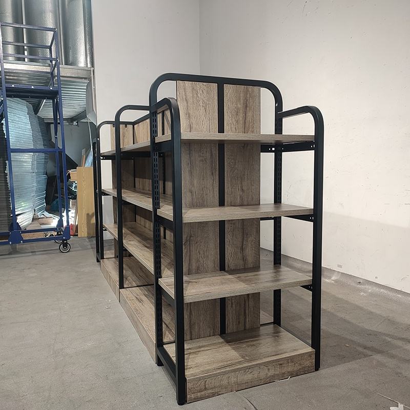 Estante de madera y tienda de farmacia personalizado Estante de supermercado Estantería de góndola Madera duradera y metal 1) Supermercado