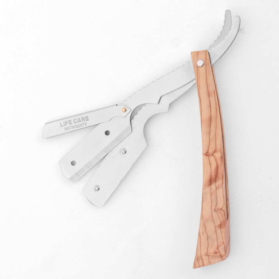 Navaja de Afeitar Profesional de Acero Inoxidable con Mango de Madera y Funda de Cuero de Life Care Instruments
