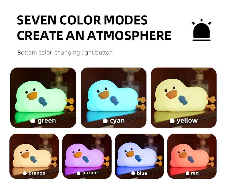 Lámpara LED de noche con forma de pato, de silicona suave, con luces de colores, recargable por USB, para dormitorio infantil, con temporizador.