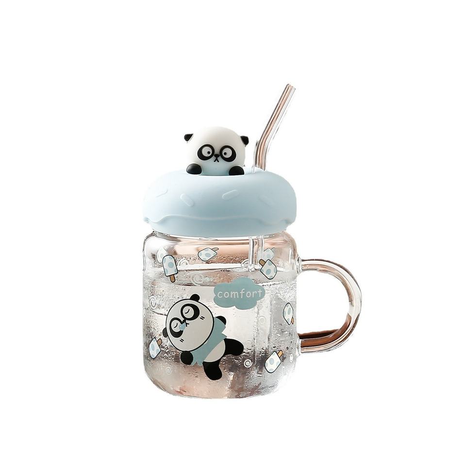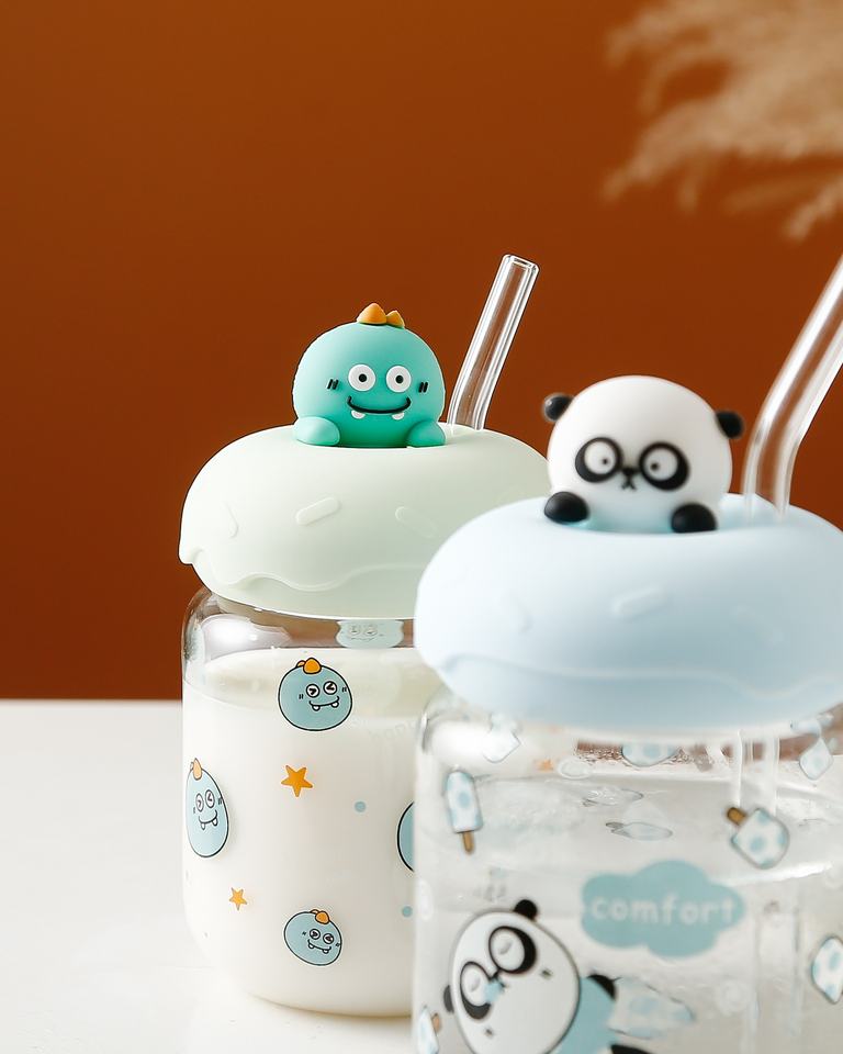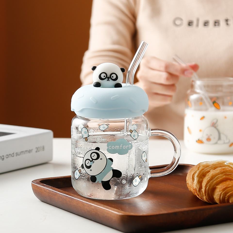 Lindo patrón de dibujos animados taza de vidrio con tapa pajita resistente a altas temperaturas taza de leche para el desayuno para niños para presentaciones de agua
