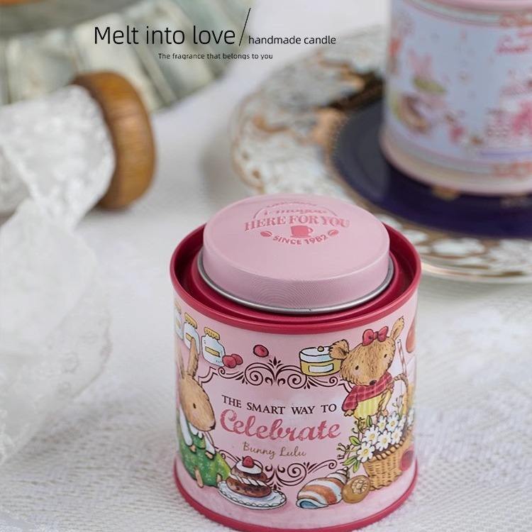 Velas aromáticas con diseño de dibujos animados en lata cilíndrica, sin humo, de cera de soja mixta, para recuerdos de boda, fragancia para dormitorio.