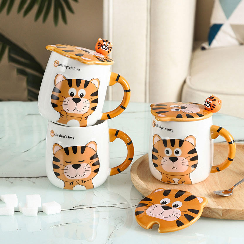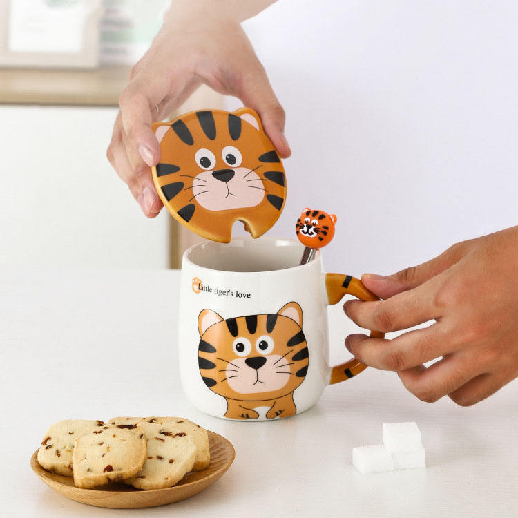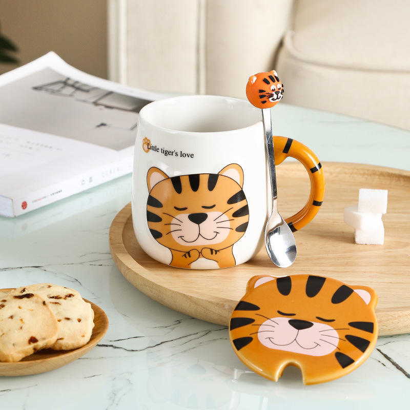 Taza de tigre de dibujos animados para niños, Taza de cerámica de café con tapa y cuchara, regalo kawaii