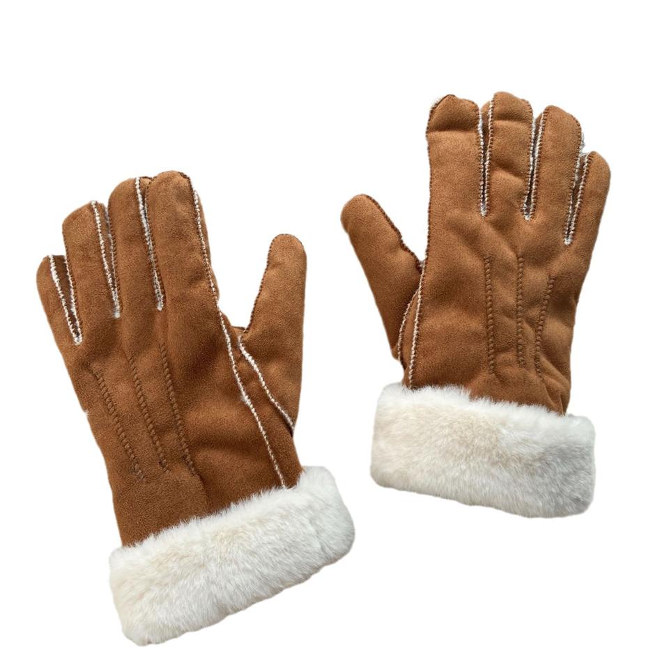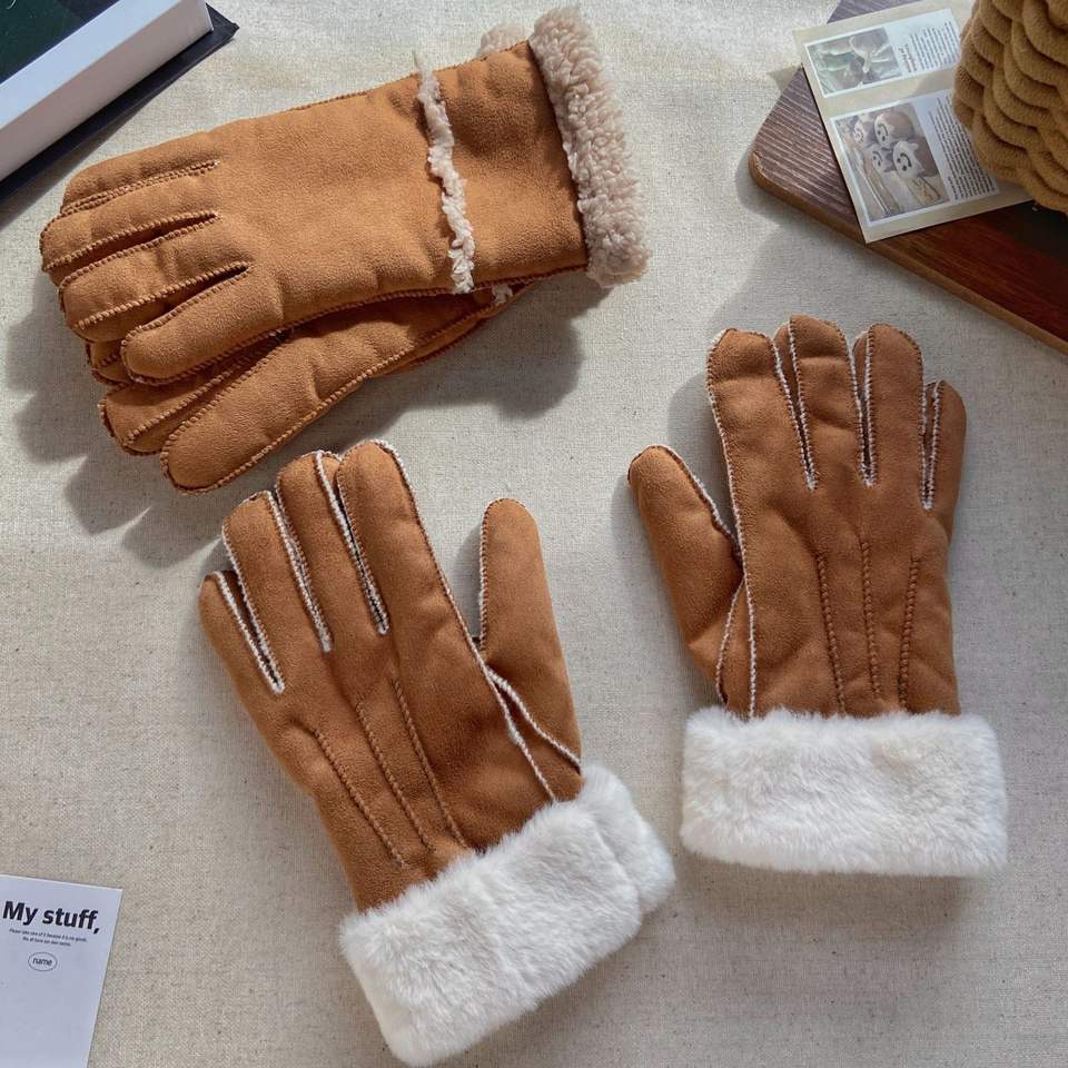 Bonitos guantes coreanos de invierno para mantener el calor, guantes gruesos de felpa, guantes de dedo dividido de color castaño, guantes de gamuza de piel de cordero Unisex para exteriores