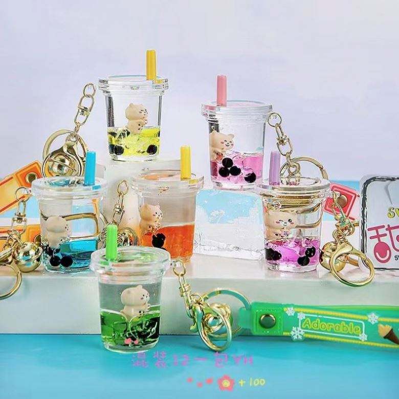 Lindo líquido dibujos animados flotante, botella llavero estudiante mochila encanto/