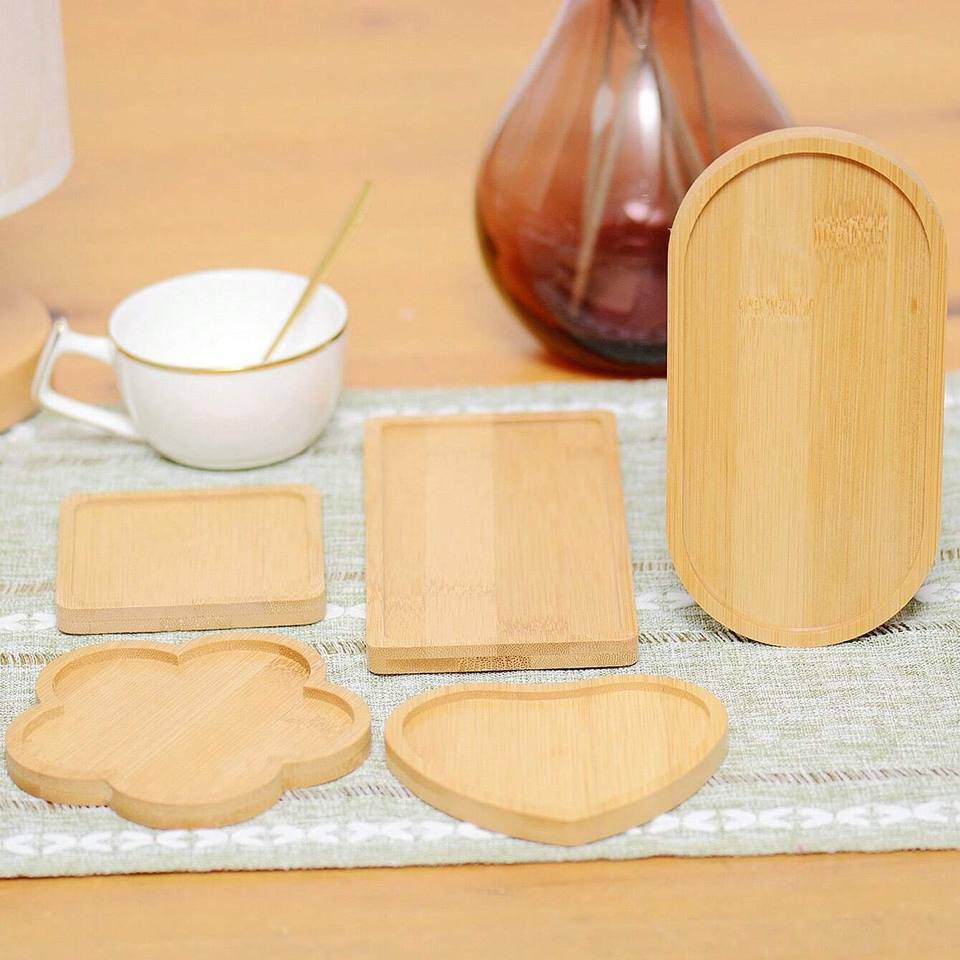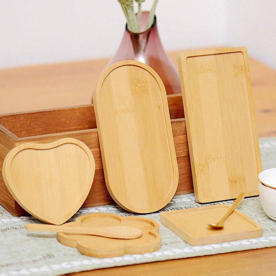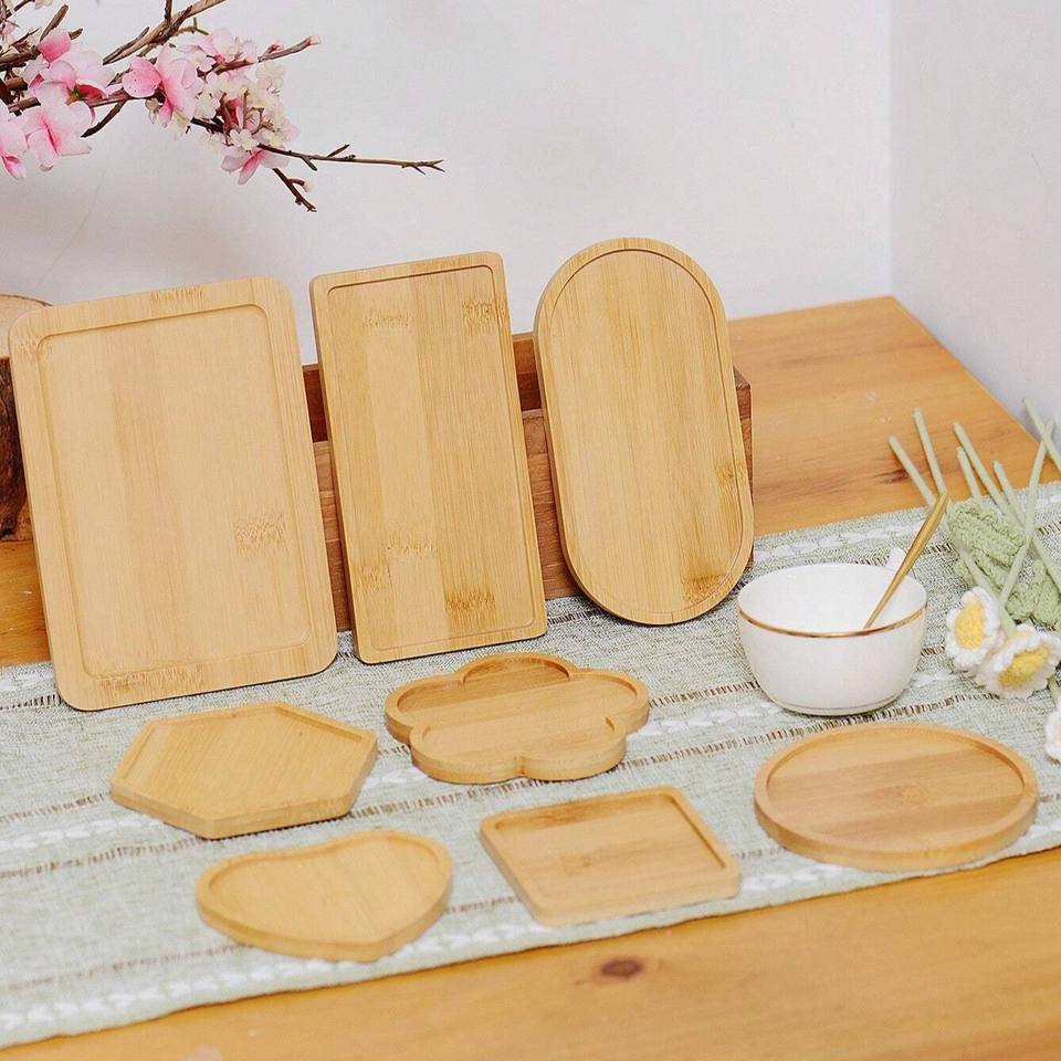 Bonita bandeja de bambú para aperitivos en varias formas bandejas de madera para exhibir alimentos de pastelería listas para exportar