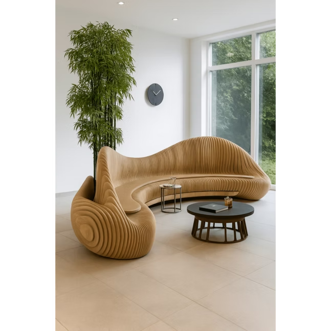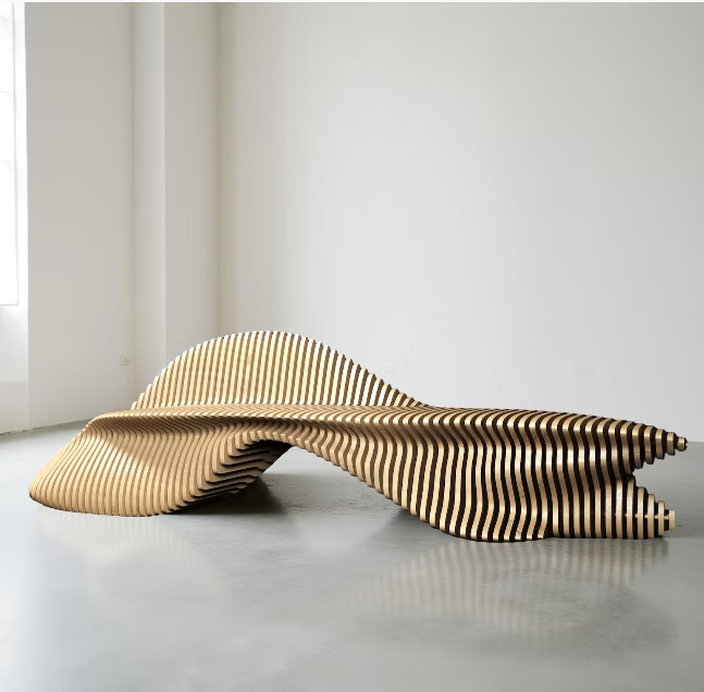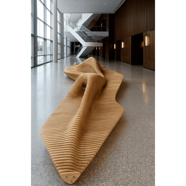 Macetas paramétricas personalizables, maceteros de madera maciza, decoración para hoteles, muebles de exterior, sofá de madera con macetero.