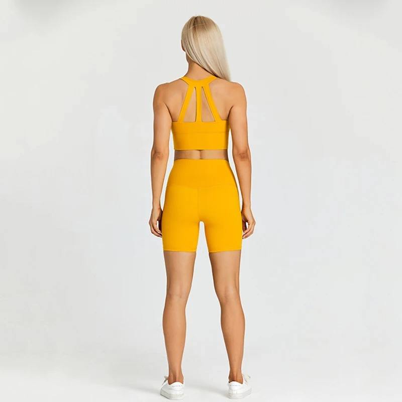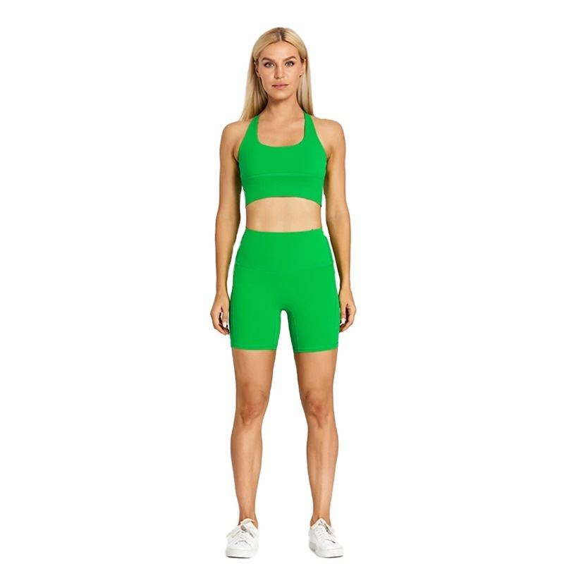 Conjunto de yoga recortado Crop Top Sujetador Bolsillos Pantalones cortos deportivos Conjunto de 2 piezas Conjunto de yoga Trajes de gimnasio Traje de entrenamiento acolchado Ropa de fitness