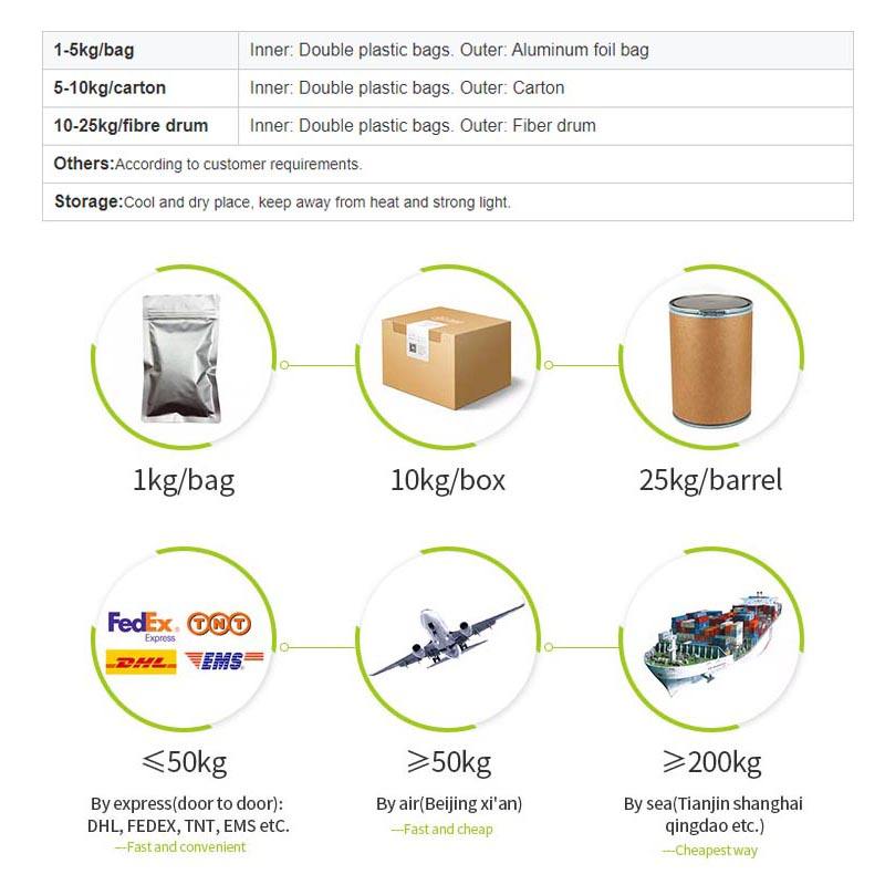 1kg por paquete, bolsa de PE de embalaje interior, bolsa de papel de aluminio de exposición exterior. 25kg barril