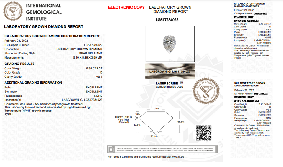 D Color VS1 Carity-diamante Labgrown pulido tamaño 0,96 CT, HPHT-CVD en forma de pera, joyería de Diamante Suelto