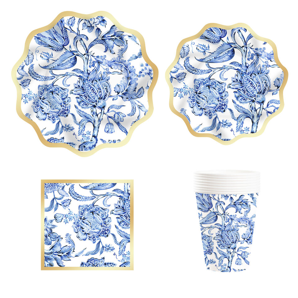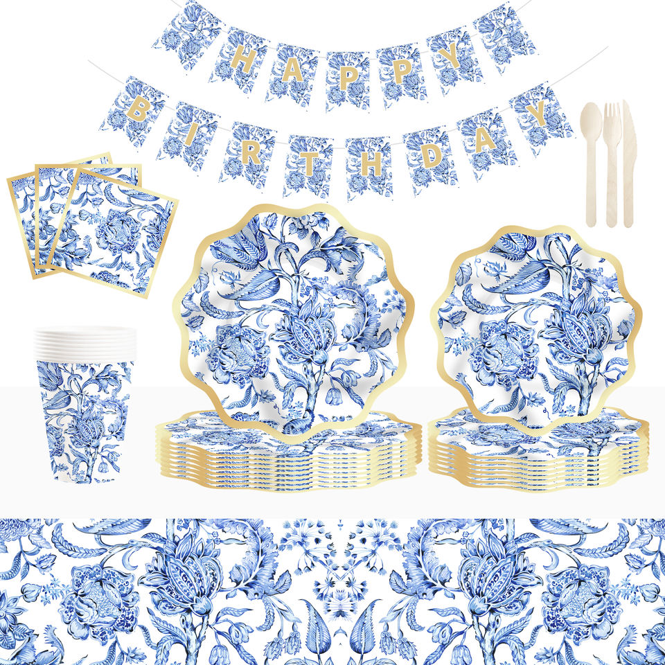 Juego de Vajilla Desechable con Diseño Floral Azul DAMAI, Platos de Papel con Estampado en Caliente, Platos de Papel Florales Azules
