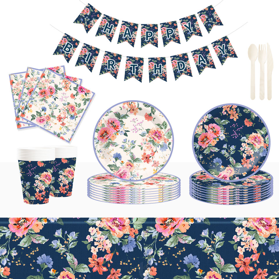 DAMAI - Juego de Vajilla Desechable de Papel con Diseño Floral Estilo Chino, Platos Redondos para Postre y Cena, Servilletas y Vasos, Artículos para Fiestas