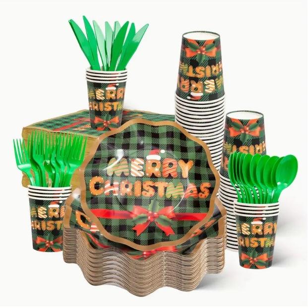 DAMAI Christmas Party Tableware Set Serves 24 Party Supplies Disposable Plates Cups Forks Spoons Knife Napkins