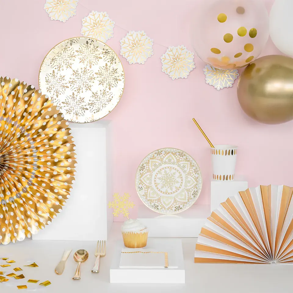 Juego de platos de fiesta con copos de nieve dorados