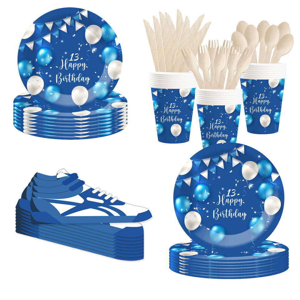 Juego de platos de papel con temática de fiesta de cumpleaños azul para niños de 13 años