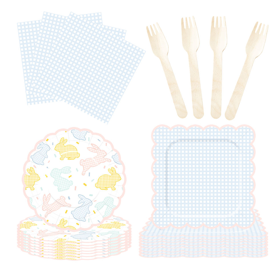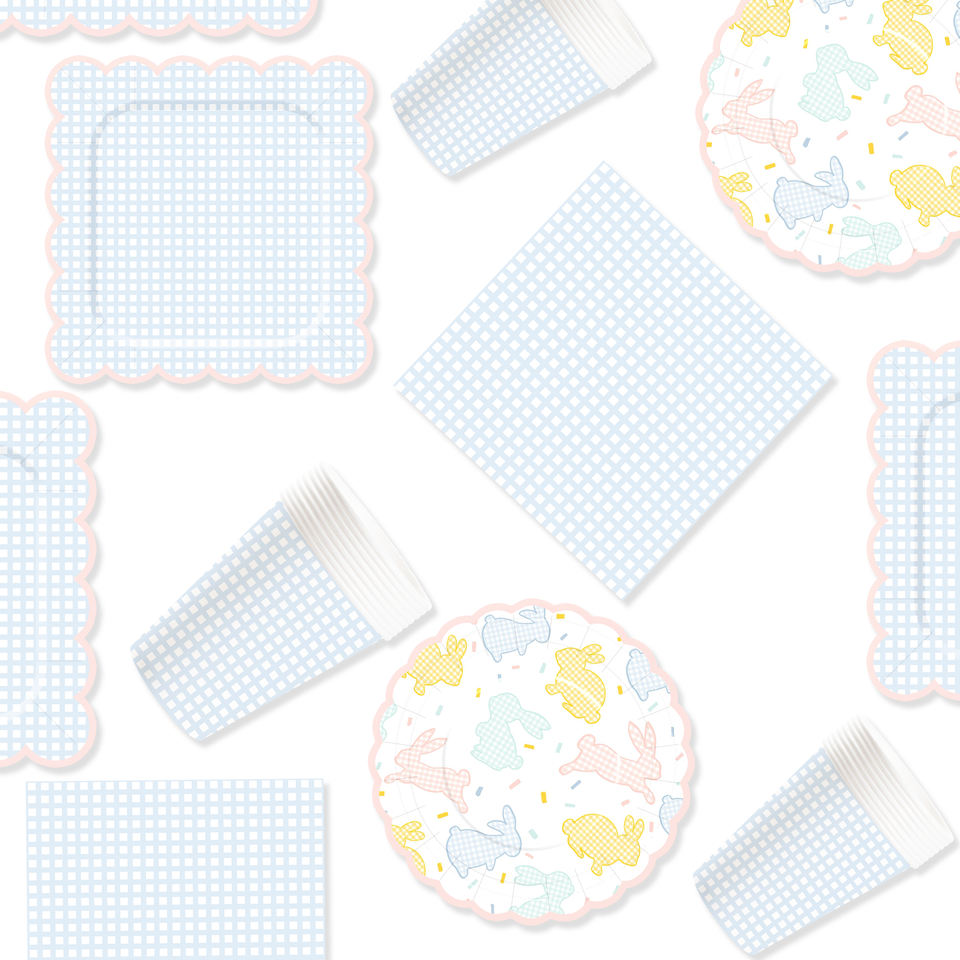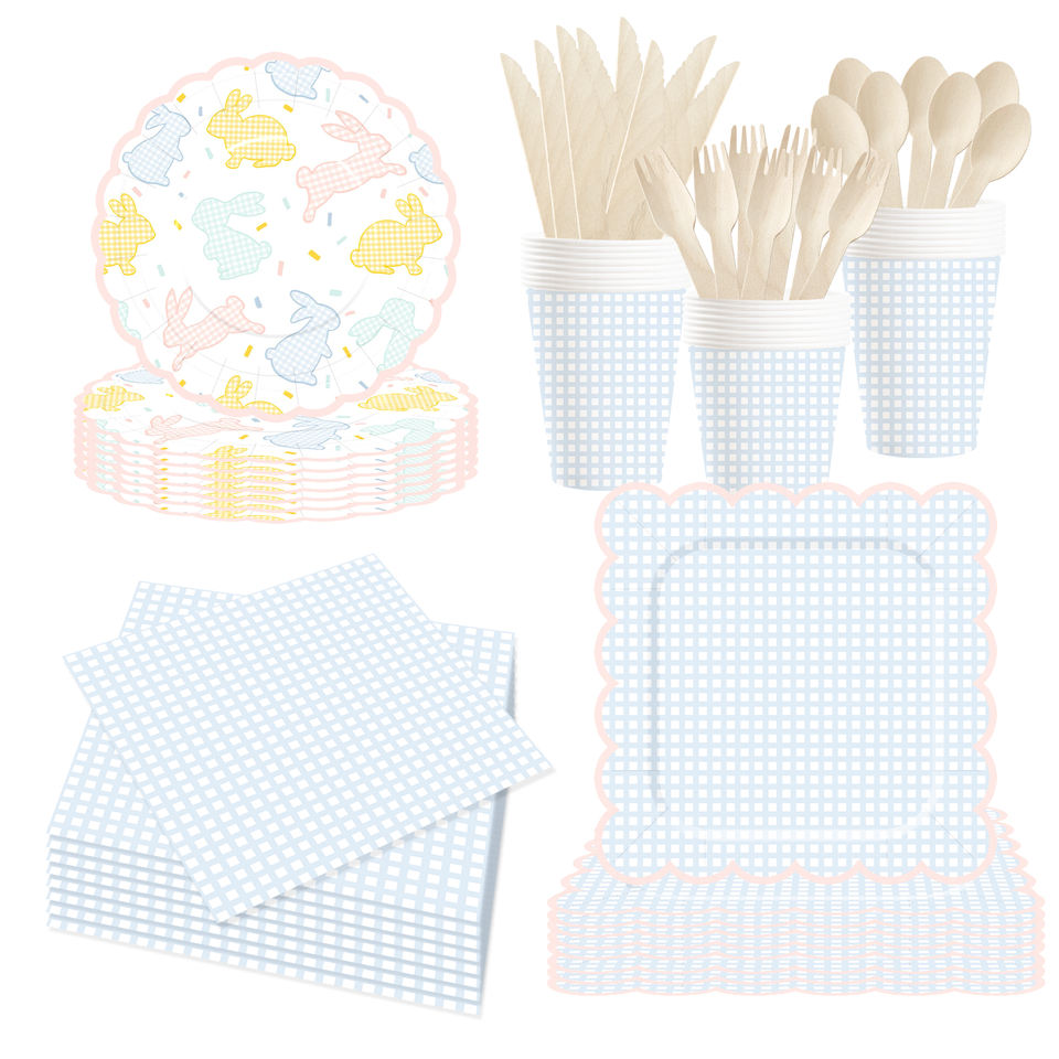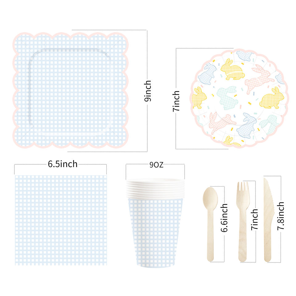DAMAI - Juego de Decoración para Fiesta de Pascua, Vajilla Desechable de Papel con Diseño de Conejo de Pascua Azul a Cuadros, Mantel, Vajilla Desechable para Fiesta