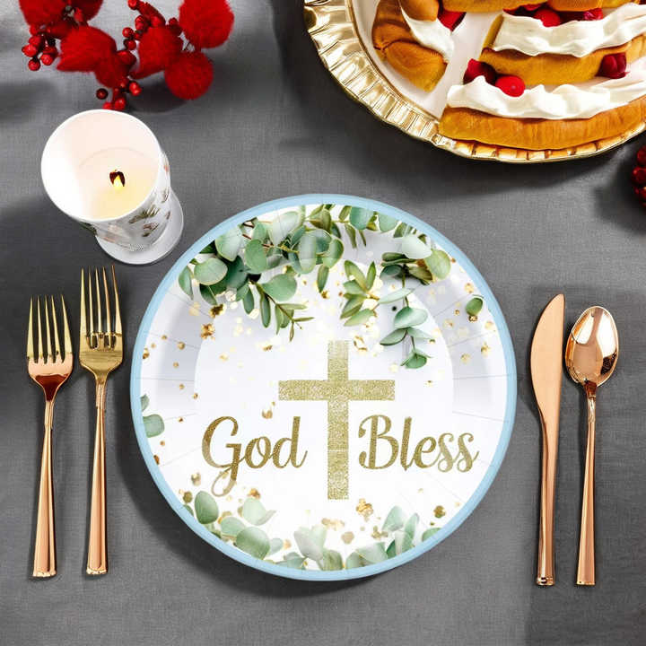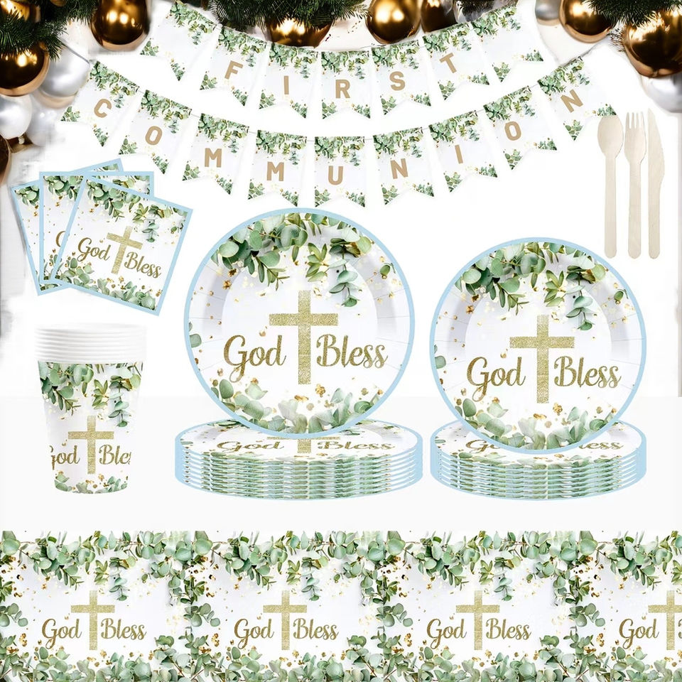 DAMAI Primera Comunión Recuerdos Fiesta Vajilla Dios Bendiga Cumpleaños Baby Shower Fiesta Suministros Vasos de papel Platos Juego de comunión