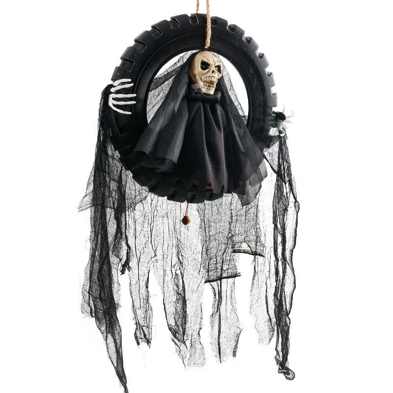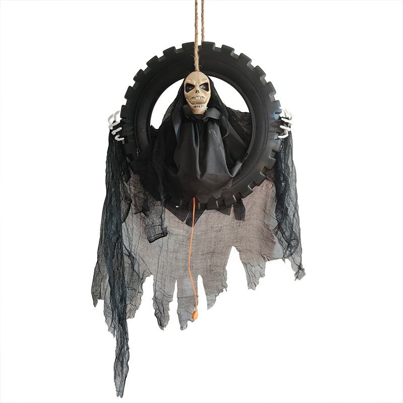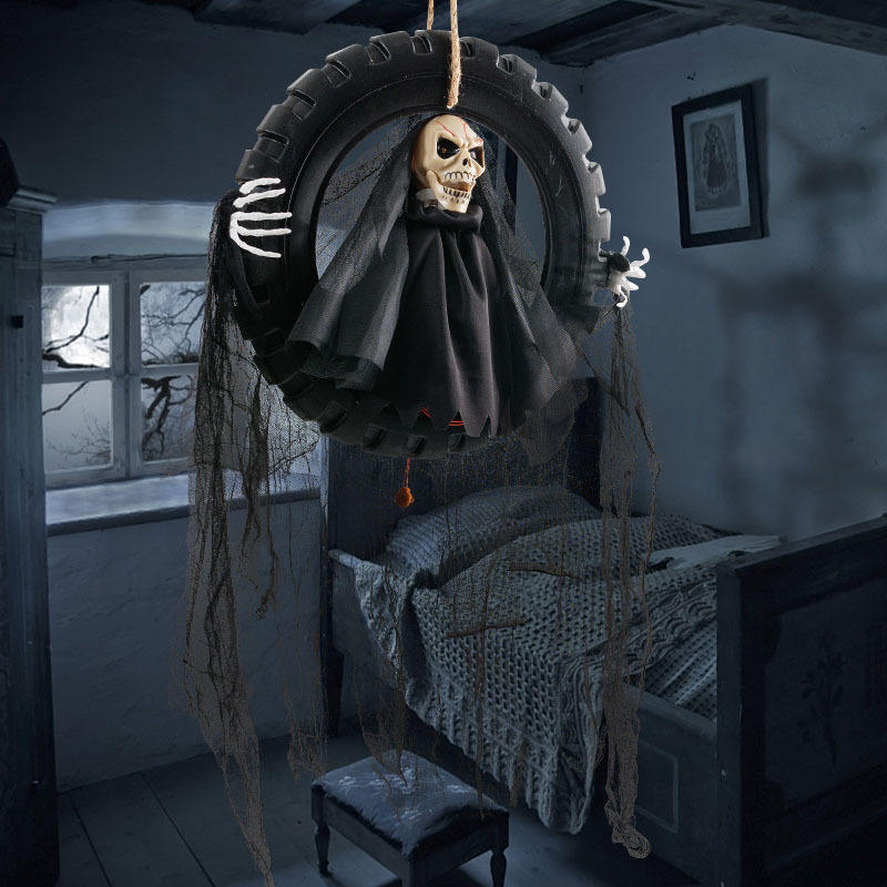 DAMAI Halloween LED - Esqueleto Animado Colgante con Cabeza Móvil de Ceñudo de la Muerte en Columpio de Neumático, Decoración y Adorno