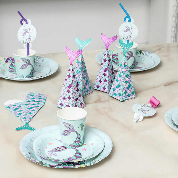 Vajilla Desechable con Temática de Sirena DAMAI para Fiestas, Platos, Vasos y Servilletas de Papel, Artículos para Fiestas Infantiles de Sirena