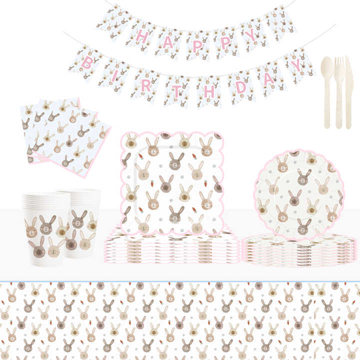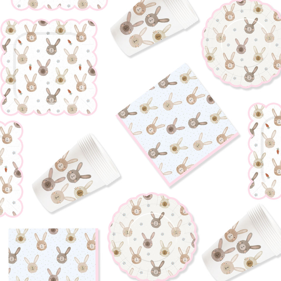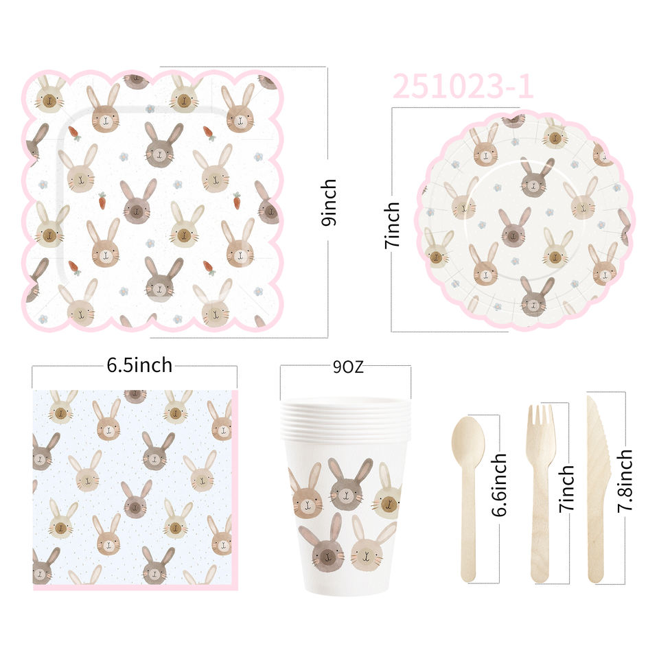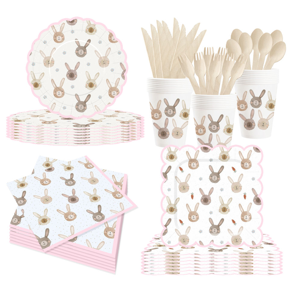 DAMAI - Juego de Vajilla Desechable con Diseño Personalizado Temático de Pascua, Platos de Papel para Postre, Vasos y Servilletas con Diseño de Conejo