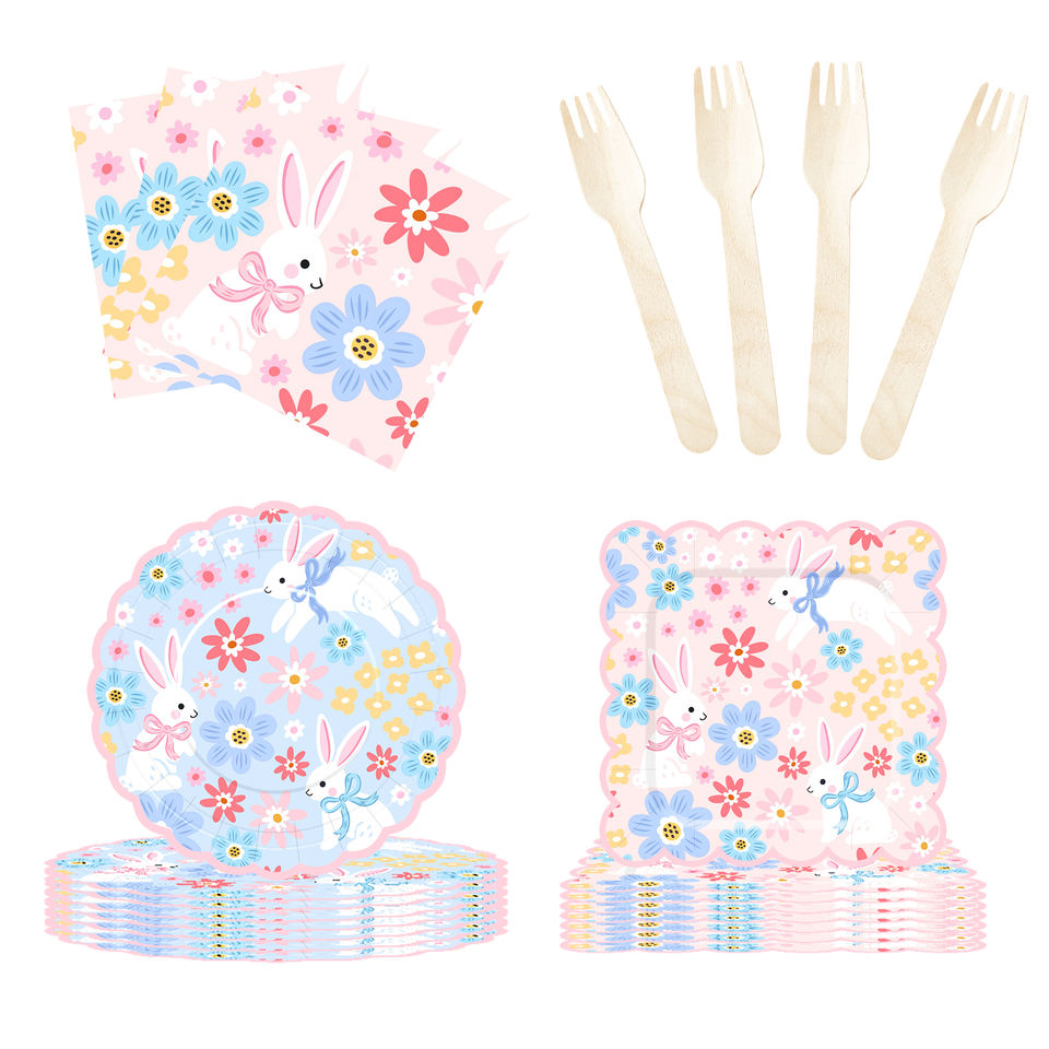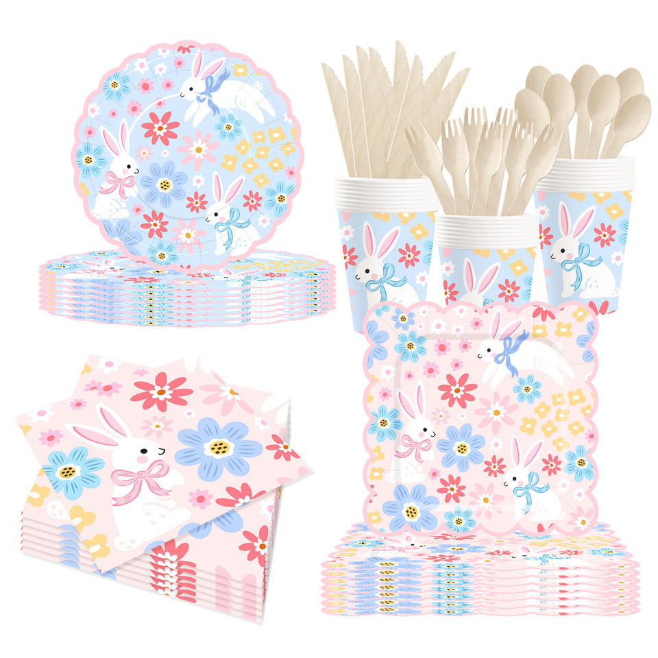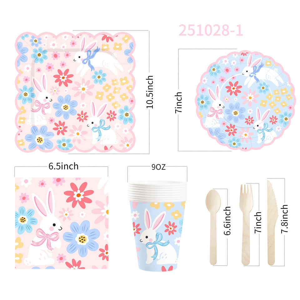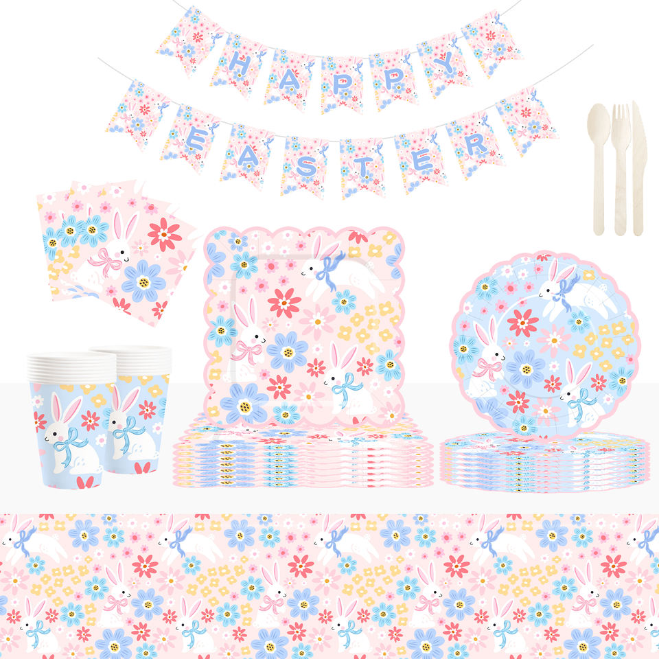 DAMAI Nuevo Juego de Vajilla Desechable con Diseño Personalizado Temático de Pascua, Platos de Papel para Postre y Cena, Vasos y Servilletas con Conejo y Flores