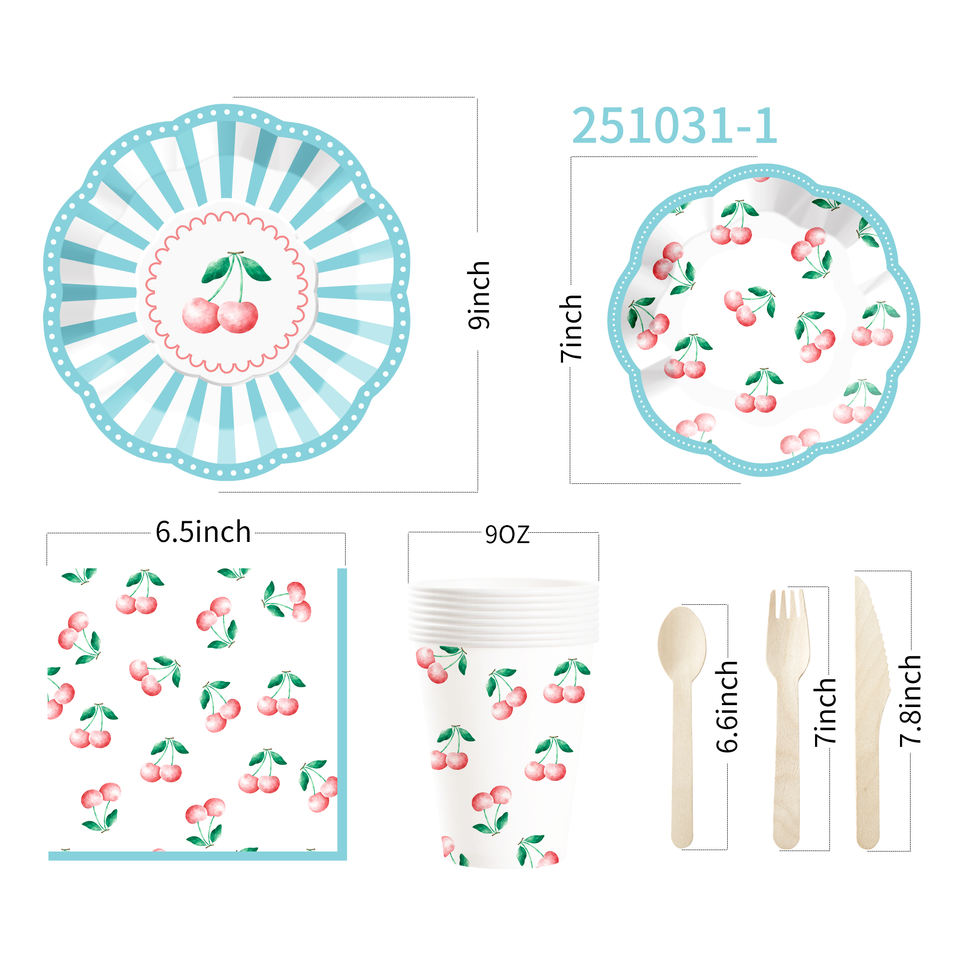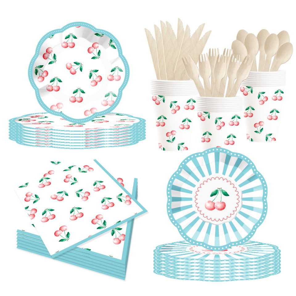 DAMAI Nuevo Juego de Vajilla Desechable con Diseño Personalizado de Frutas, Platos, Vasos y Servilletas de Papel Azules con Temática de Cereza