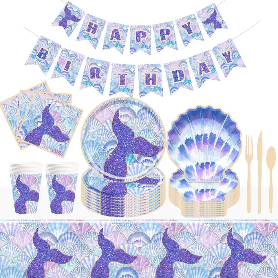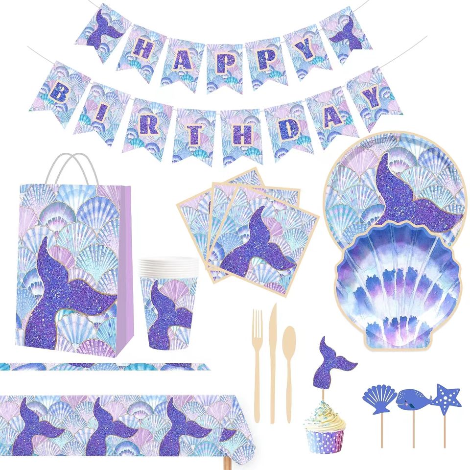 Juego de Vajilla Desechable DAMAI para Fiesta de Cumpleaños, Diseño de Sirena Azul y Morado, Platos, Vasos y Servilletas de Papel