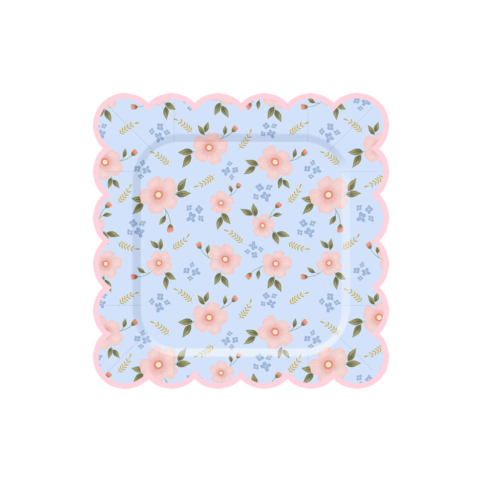 Juego de Platos Desechables de Papel con Diseño de Conejo y Cesta de Bambú, con Borde de Ondas Azules y Pequeñas Flores Rosas, para el Festival de Pascua, Marca DAMAI