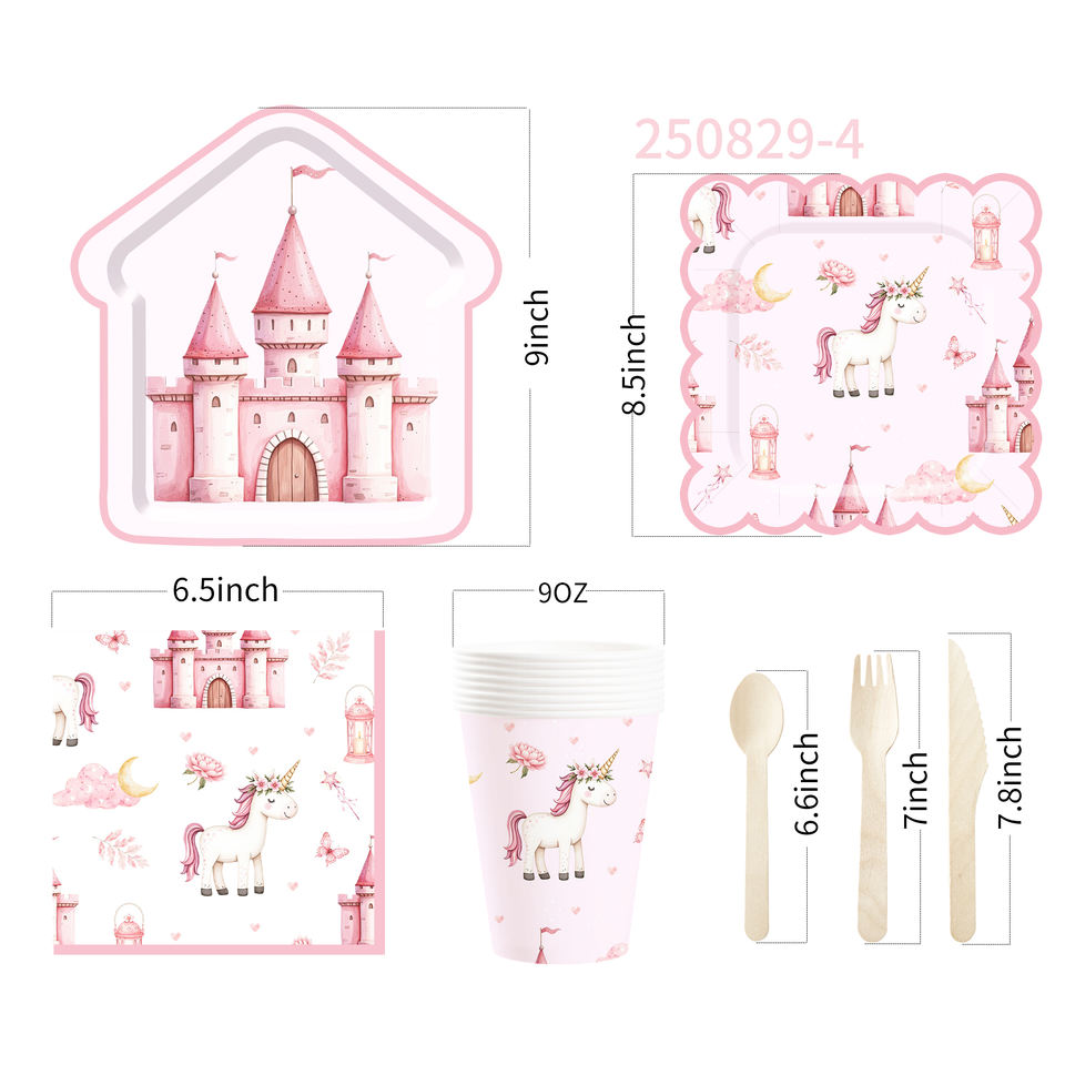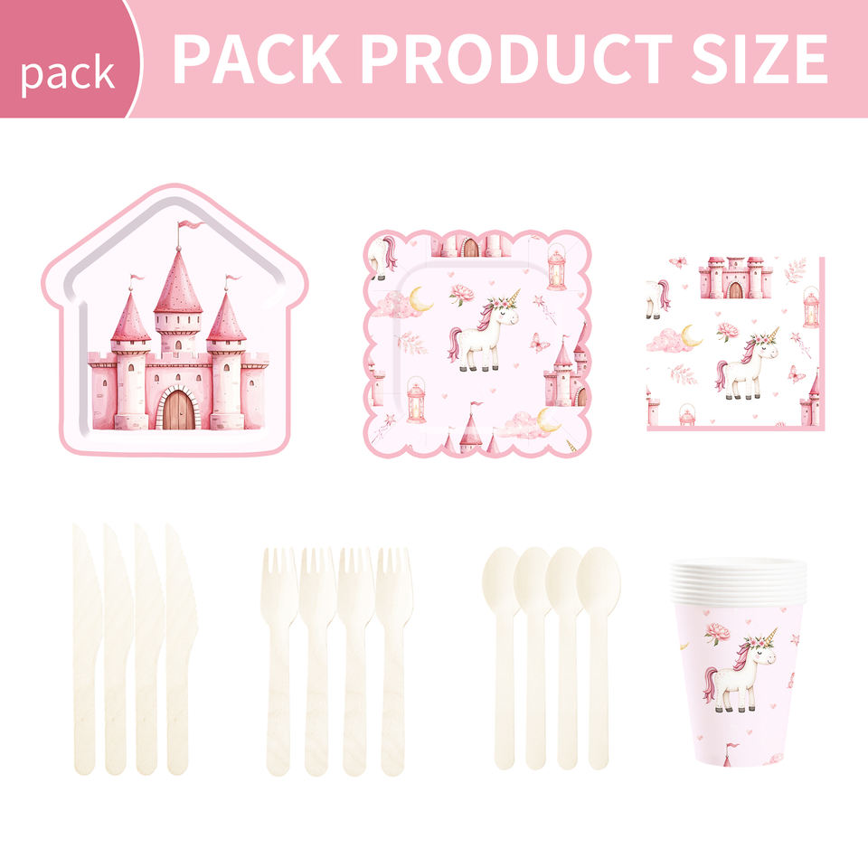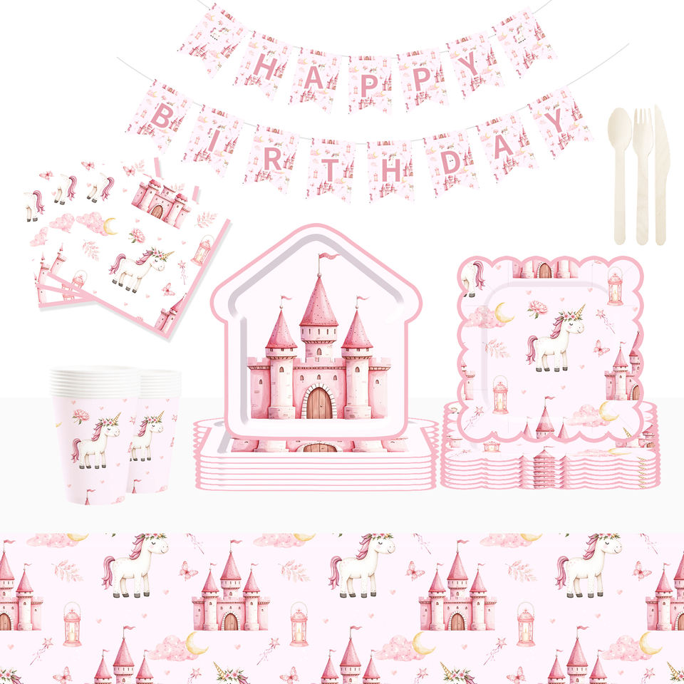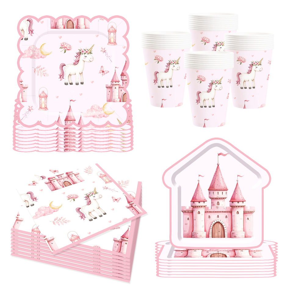 Juego de Vajilla Desechable DAMAI Unicornio para Fiestas de Cumpleaños de Niñas, Platos, Vasos y Servilletas de Papel con Diseño de Castillo Rosa y Unicornio, Artículos para Fiestas