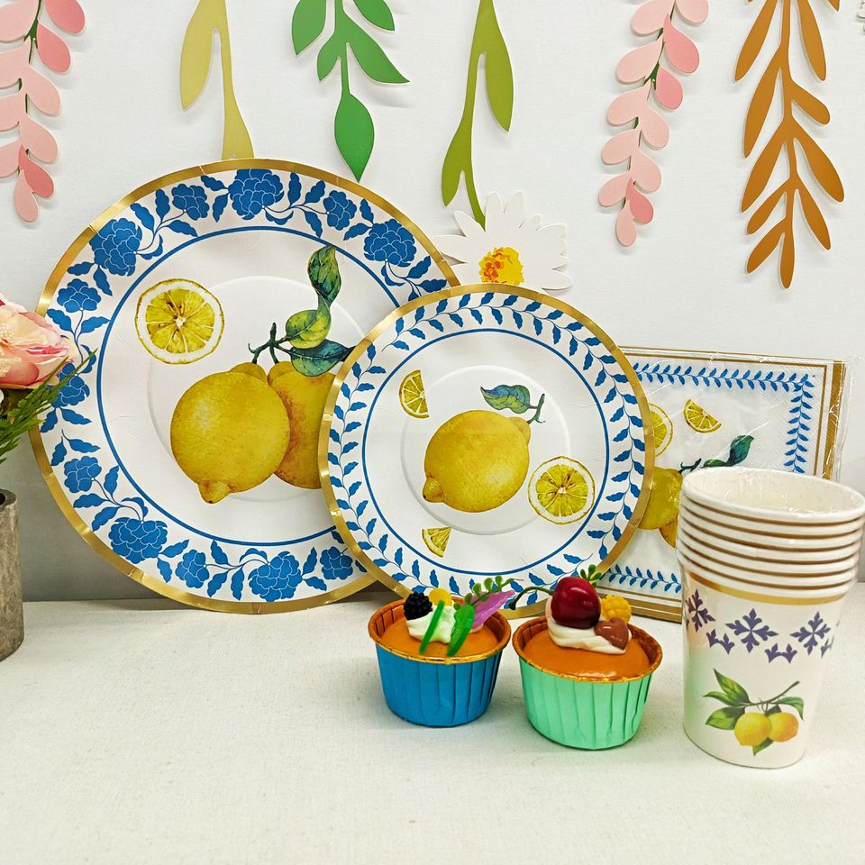 DAMAI Artículos para Fiestas Temáticas Amarillas, Decoraciones de Frutas Primaverales, Rollo de Limón y Peonía para Juego de Vajilla Desechable, Plato y Servilleta