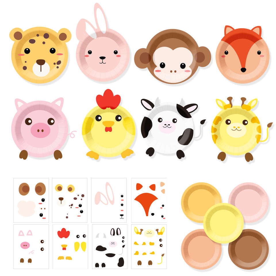 DAMIA Kit de Arte con 8 Platos de Papel, Tema Animal, con 8 Colores, Platos Redondos Desechables para Manualidades, Juegos de Fiesta para Preescolar