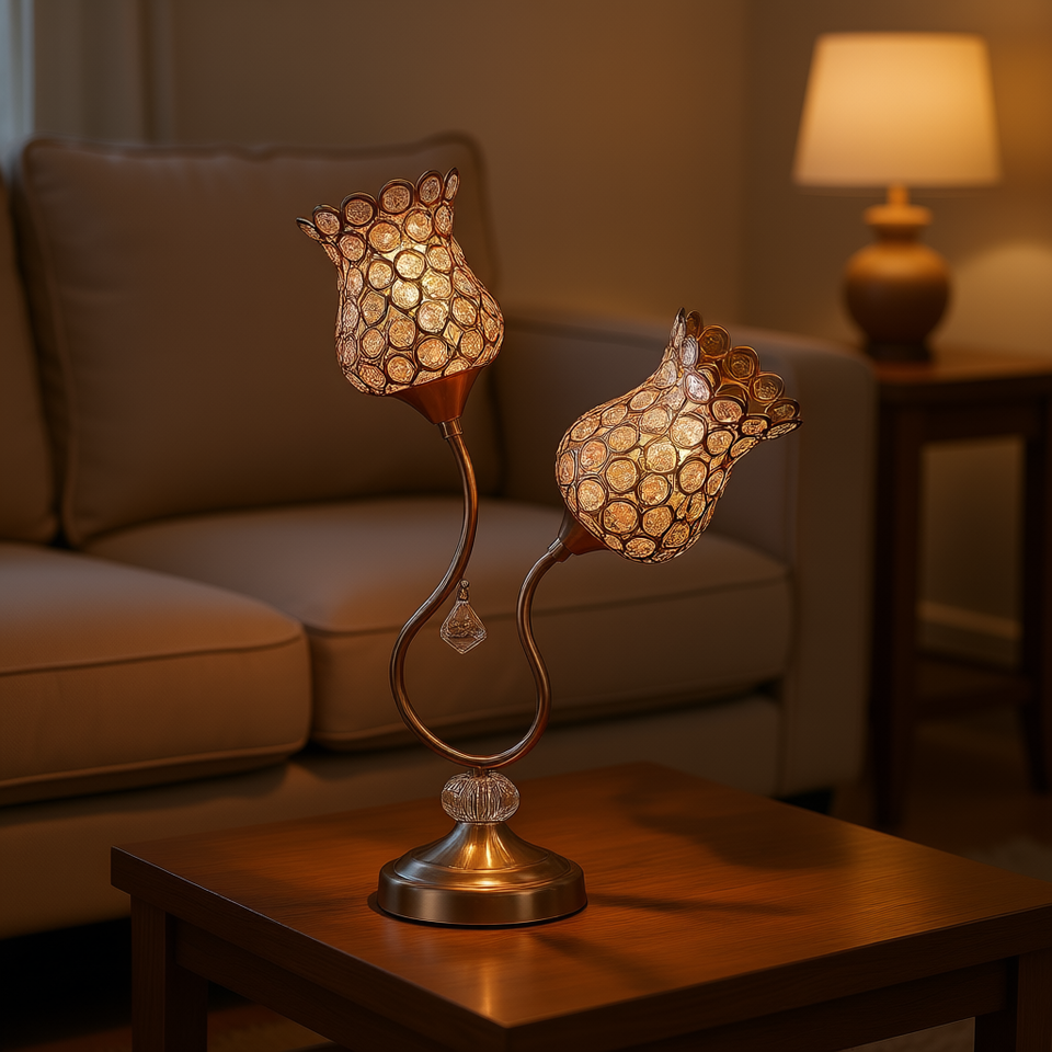 Lámpara de Mesa Glamour de Metal Dorado Rosa con 2 Flores y Pantalla de Vidrio para Iluminación de Dormitorio