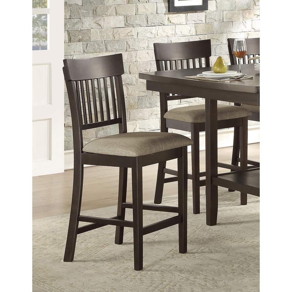 Juego de 2 sillas de comedor de altura de mostrador DB, diseño de respaldo de listón Vertical con acabado marrón oscuro con muebles de asiento acolchado de tela tipo Lenin
