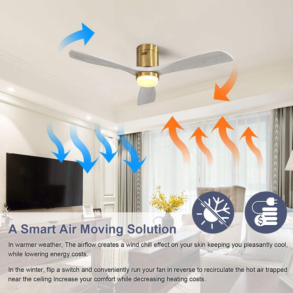 Ventilador de techo LED DB de 52 pulgadas con luz, 3 aspas de madera, motor DC y control remoto para sala de estar