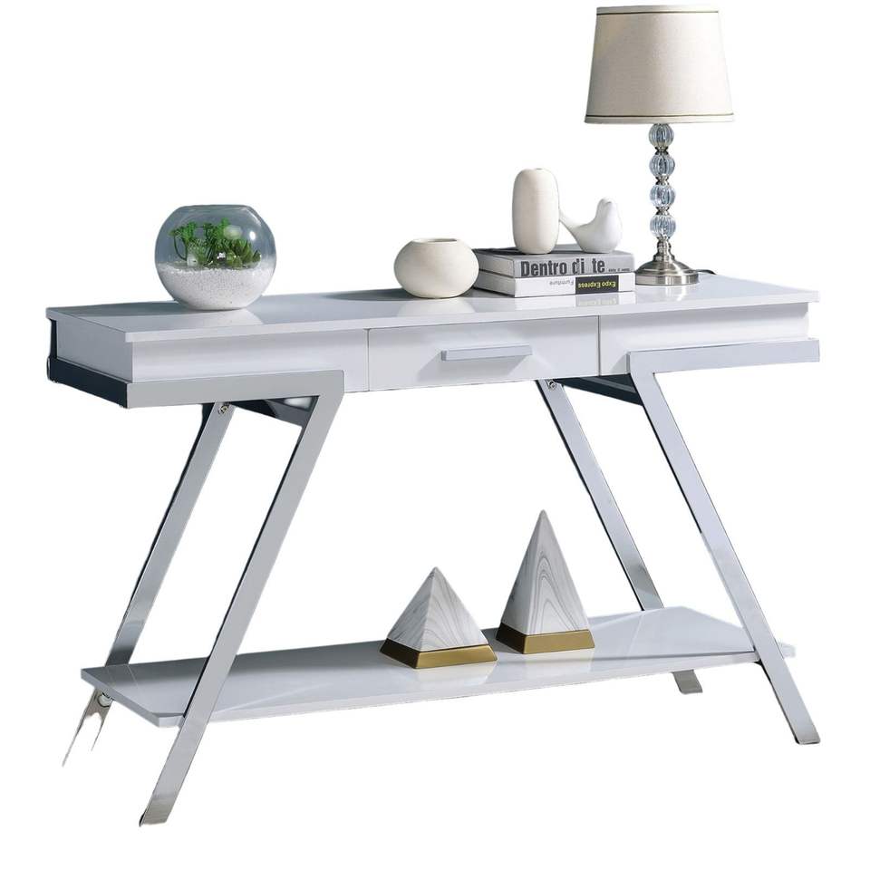 DB Estilo contemporáneo Blanco 1 pieza Mesa de sofá Acabado de alto brillo Marco cromado Consola Durable Muebles de sala de estar hermosos