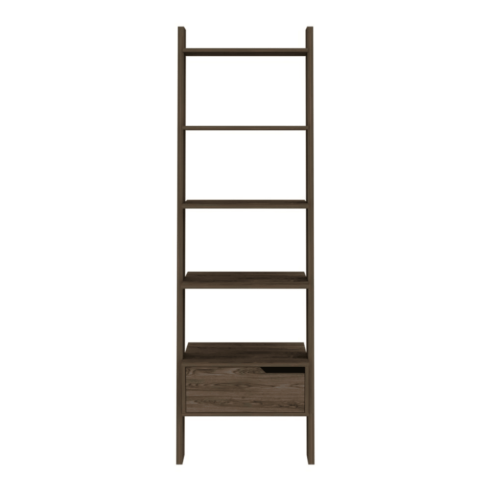 Estantería de escalera con acabado de nogal oscuro DB con un cajón de toro y cinco estantes abiertos