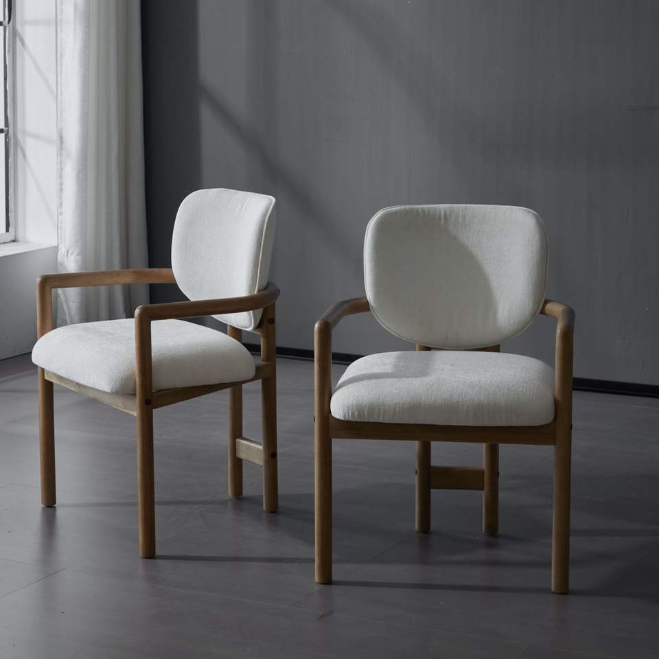 Juego de sillas de comedor DB, 2 sillas de acento de brazo tapizadas de tela blanca, asientos de madera de goma de PC maciza, capacidad de peso de 300 libras