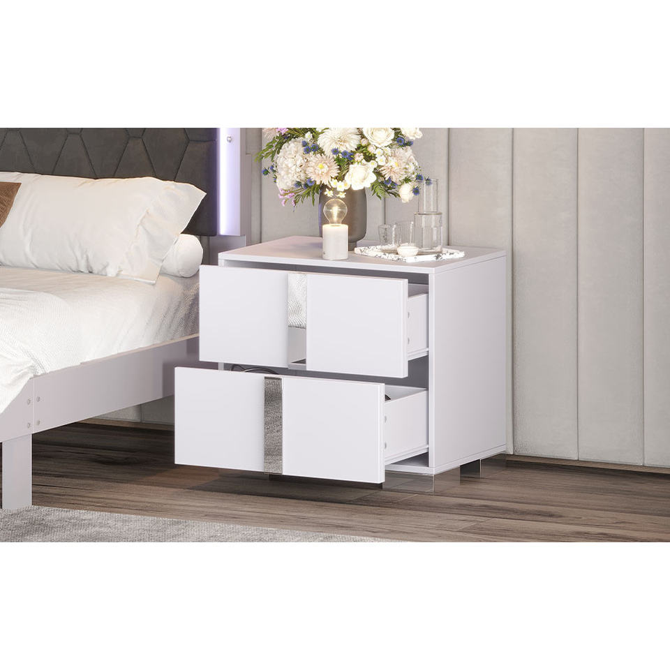 Mesita de noche con espejo elegante DB con 2 cajones para dormitorio o sala de estar blanca con asa de metal