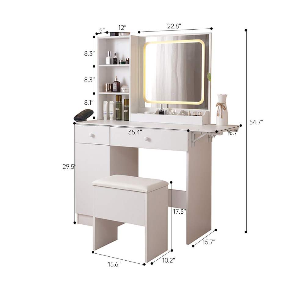 Escritorio de tocador de 3 cajones de almacenamiento grande DB con espejo iluminado y toma de corriente para aplicaciones de maquillaje de dormitorio