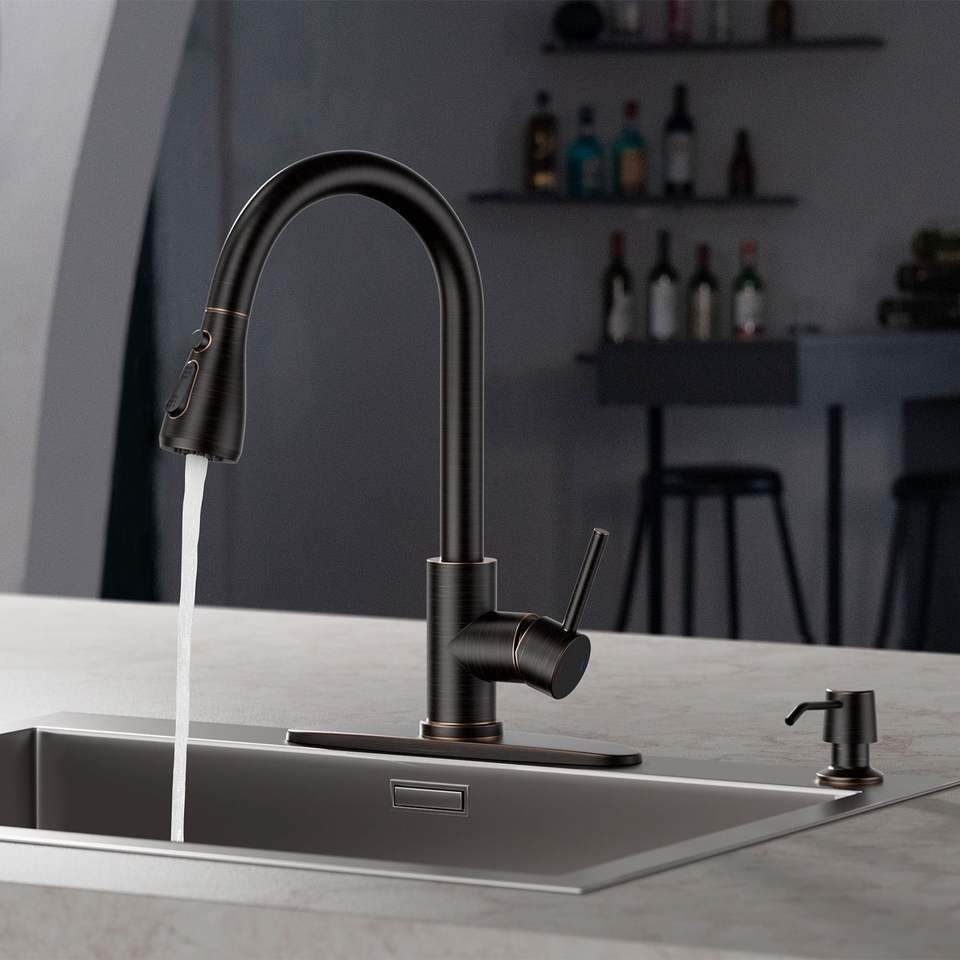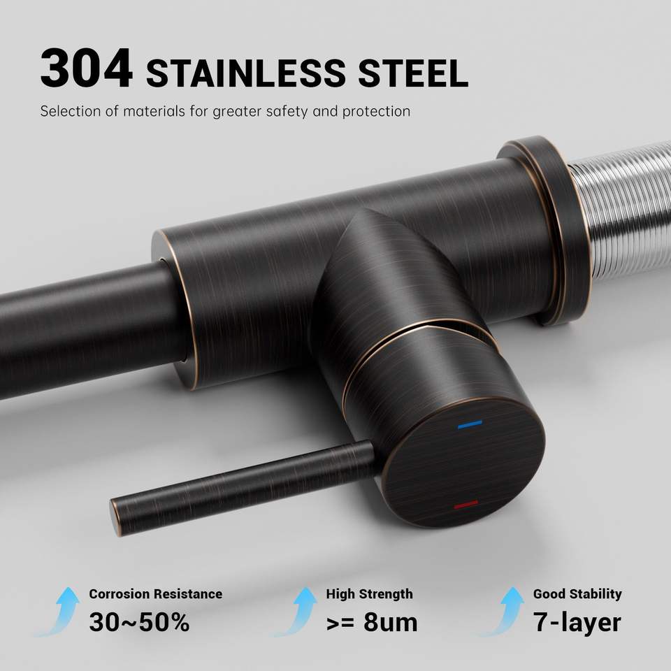 Grifo de Cocina Clásico Moderno, Negro Mate, Acero Inoxidable, Rociador Extraíble, Doble Manija, Montaje en Encimera, 1 Orificio