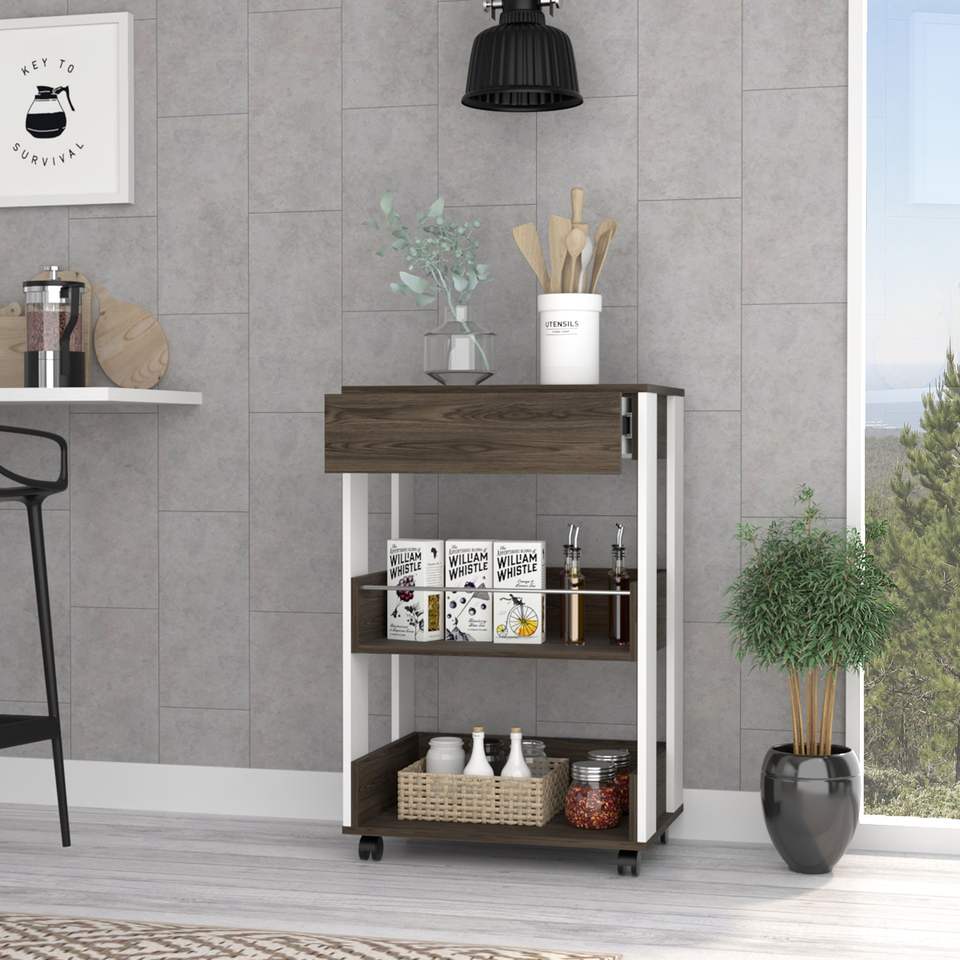 Carrito de cocina de diseño moderno DB Coron con estantes y ruedas de madera de tres niveles con acabado de nogal Blanco/oscuro con cajón