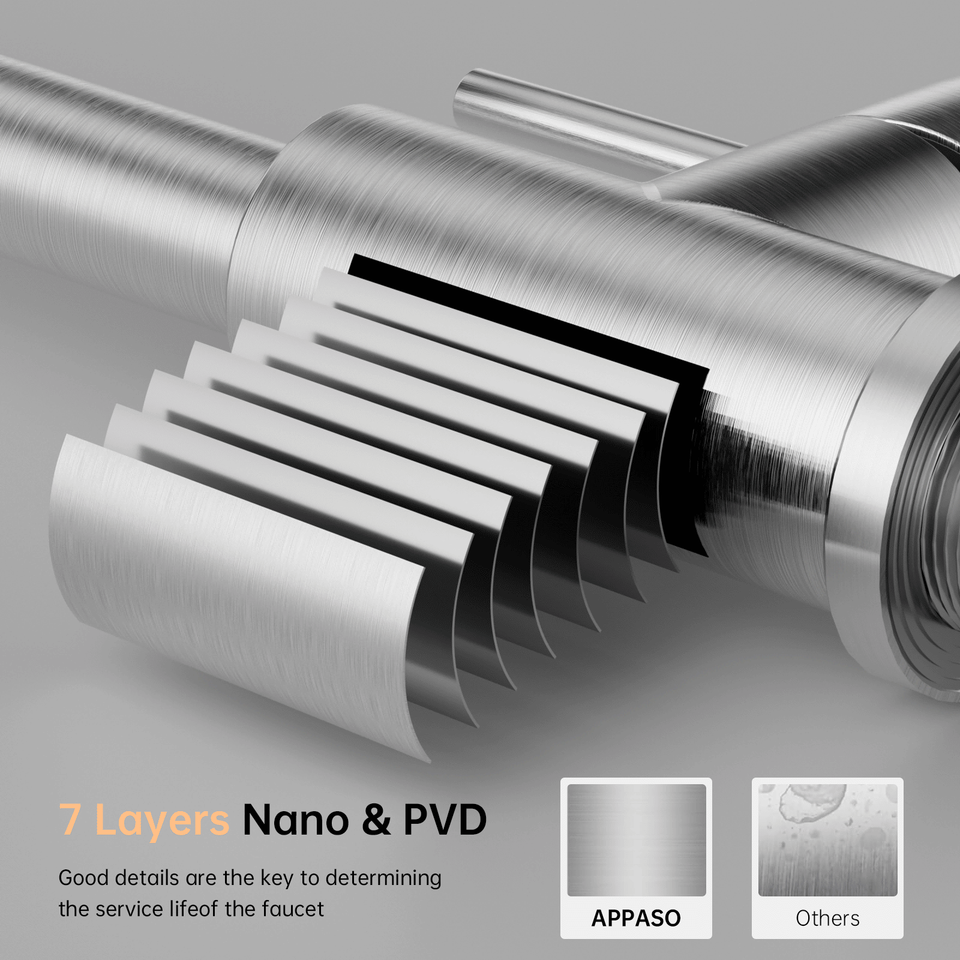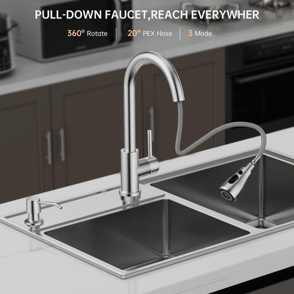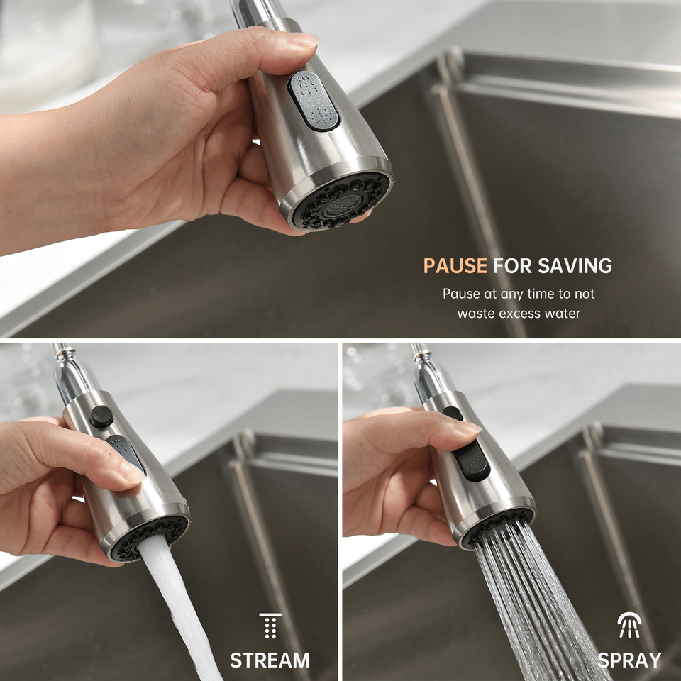 Grifo de cocina moderno DB con acabado en oro rosa, rociador de tracción de acero inoxidable sólido, dispensador de jabón de 3 modos