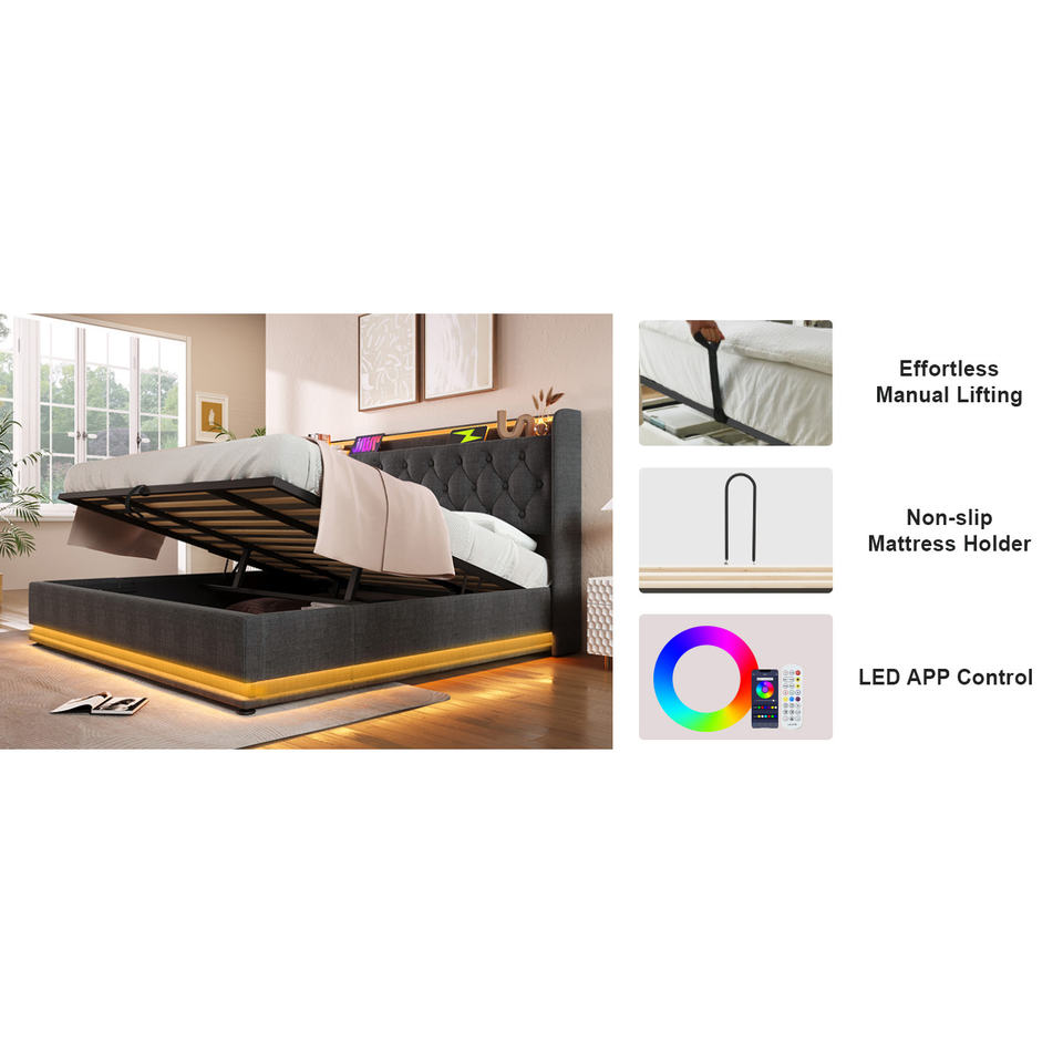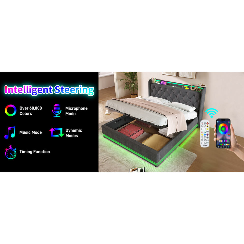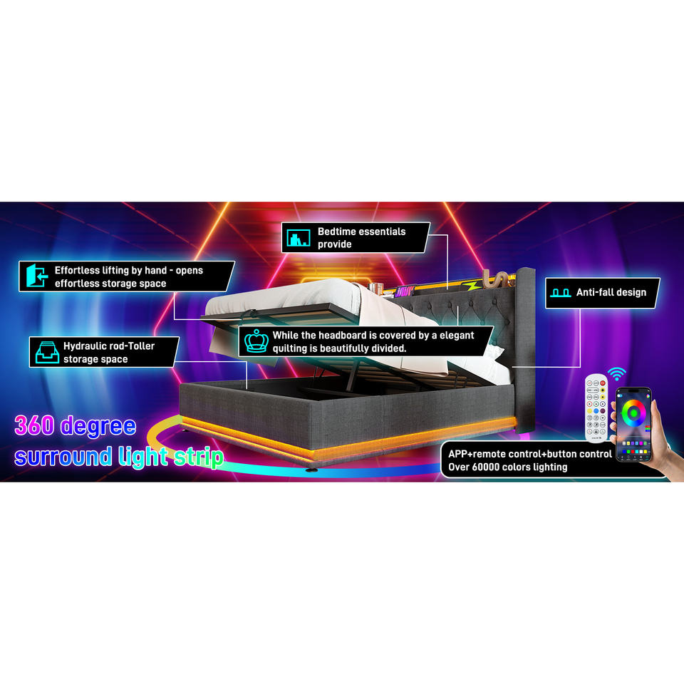 Cama tapizada tamaño Queen DB con LED envolvente 360 y almacenamiento hidráulico, botones USB tipo C/aplicaciones/control remoto para uso en apartamentos