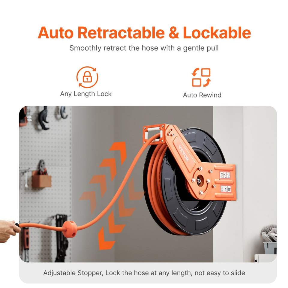 DB Wholesale 3/8 in X 100 FT Carrete de manguera de aire retráctil Carrete de manguera de jardín con Max 300 PSI Hecho de ABS y acero Longitud 20m
