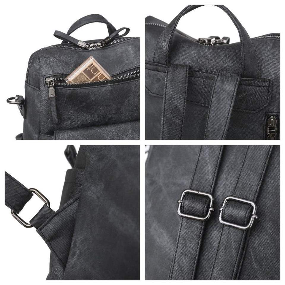 Mochila informal DB para mujer, monedero de cuero PU negro con cierre abierto, diseño de moda, decoración de letras, dos asas/cinturones