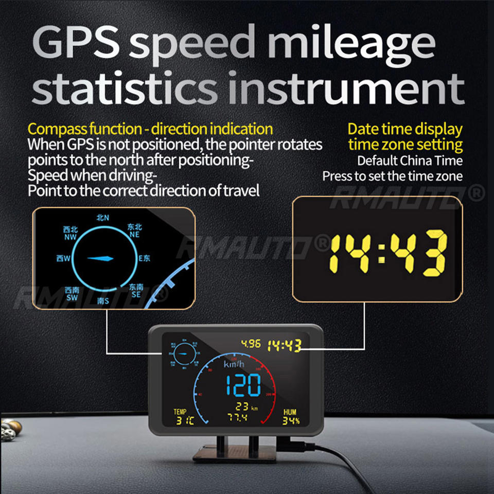 Velocímetro GPS Multifunción para Automóvil DC5-24V, Pantalla de Visualización Frontal HUD, Brújula, Altitud, Temperatura, Humedad