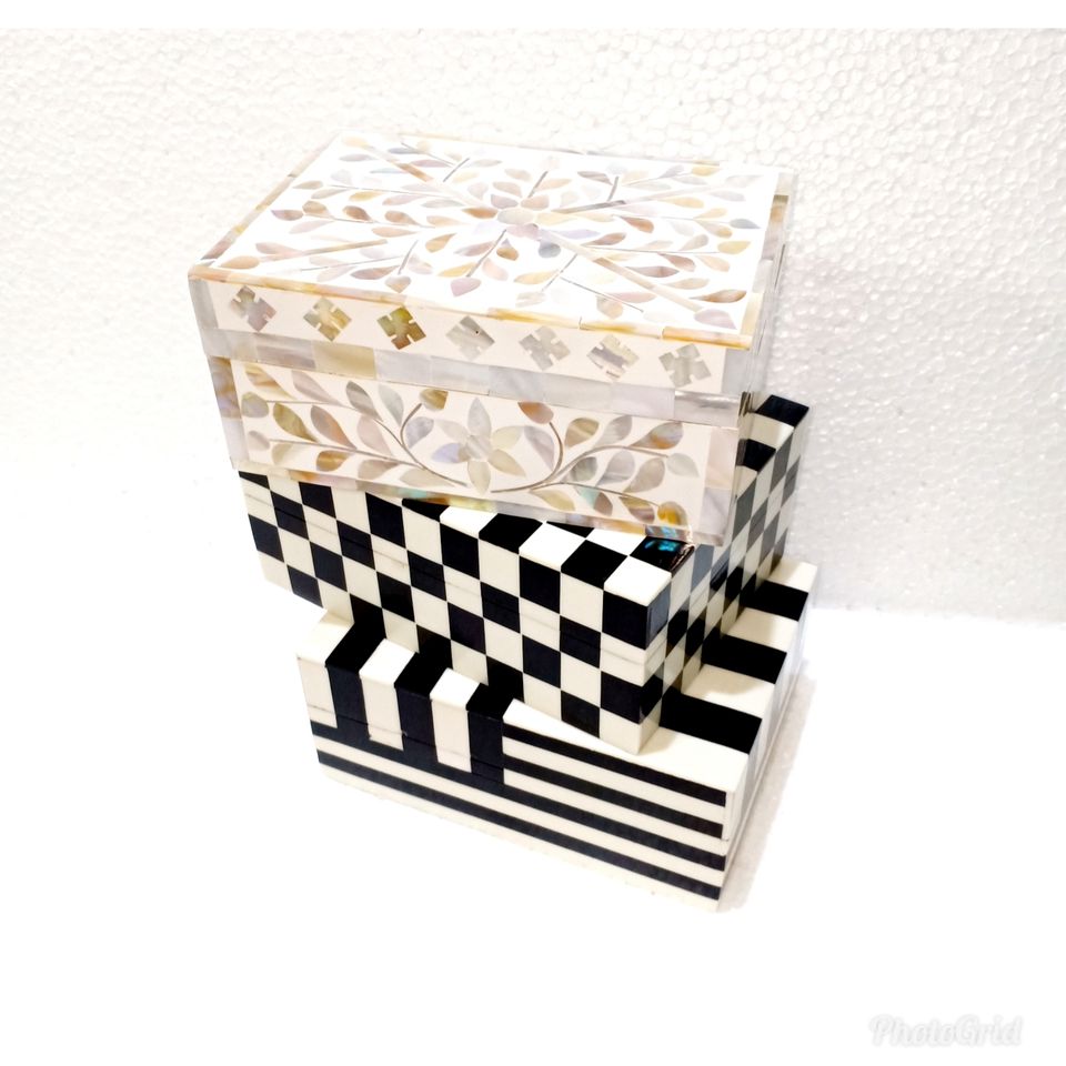 Cajas de anillos de estilo amor talladas personalizadas de calidad superior, embalaje artesanal natural exclusivo para joyería de perlas madre con incrustaciones de hueso