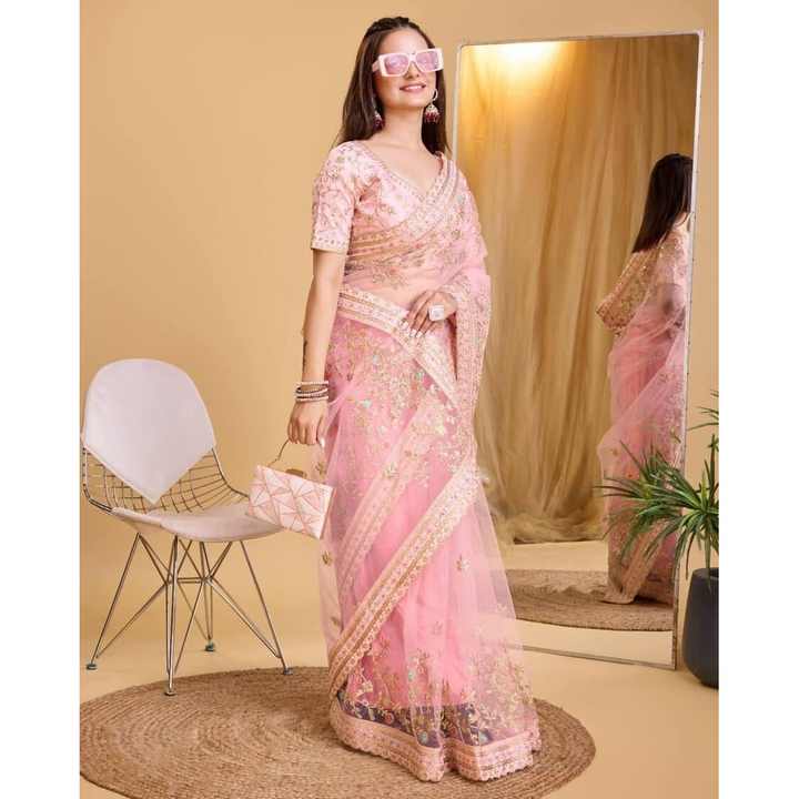 DISEÑADOR MARIPOSA RED BORDADO TRABAJO SAREE CON BLUSA DESCOSTADA MELOCOTÓN
