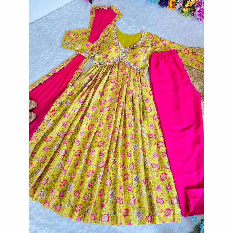 DISEÑADOR CHINON DIGITAL IMPRESO BORDADO A MANO ENCAJE WOPRK ALIA CUT VESTIDO INFERIOR CON DUPATTA AMARILLO